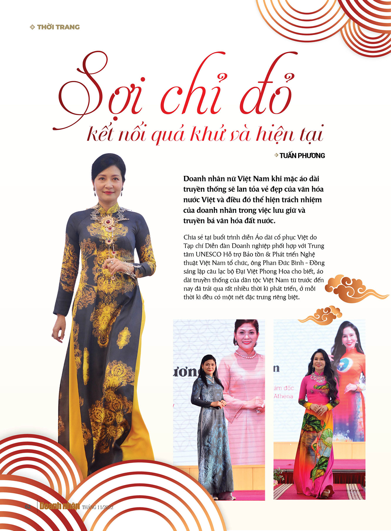 Doanh nhân Việt Nam khoác bộ trang phục áo dài truyền thống Việt Nam không chỉ làm đẹp cho chính mình mà còn lan truyền vẻ đẹp của văn hóa nước Việt. Đó là sợi chỉ đỏ kết nối quá khứ và hiện tại, thể hiện trách nhiệm của doanh nhân lưu giữ và truyền bá văn hóa nước Việt, góp phần giúp doanh nghiệp tôn thêm giá trị nhân văn cho thương hiệu.